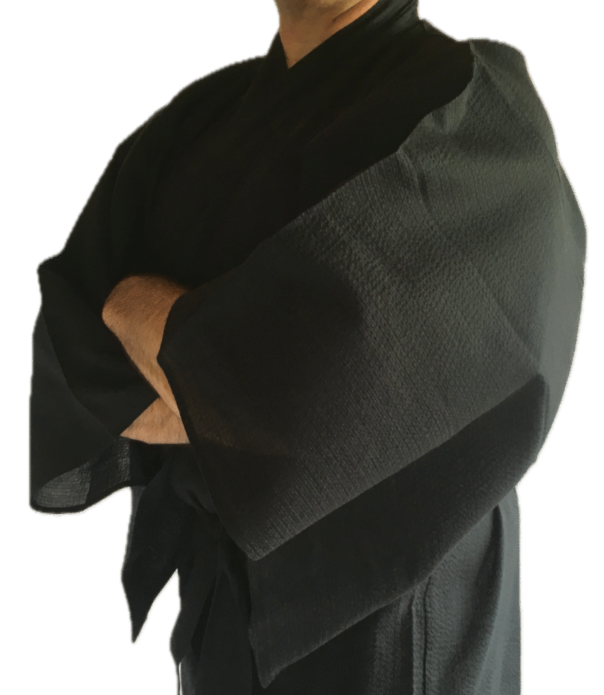Plus long et ample que son pendant féminin, le haori masculin possède des manches encore plus grandes dont les pans retombent presque jusqu’au sol. Fermé par un obi noué sur le devant, il se porte traditionnellement avec le hakama, sorte de pantalon-jupe emblématique du costume traditionnel masculin japonais