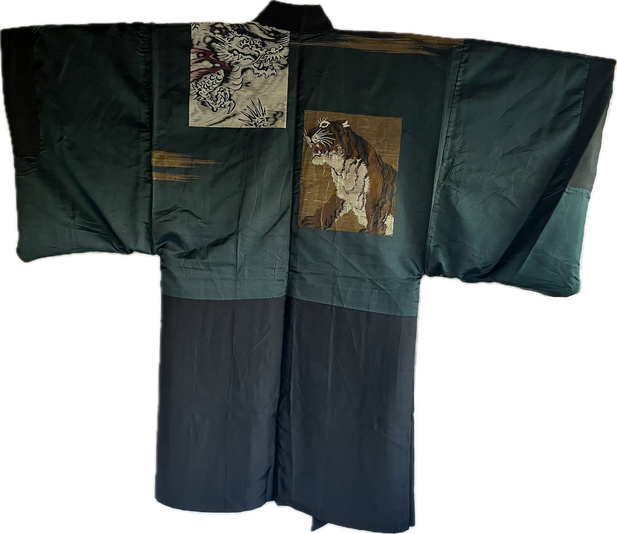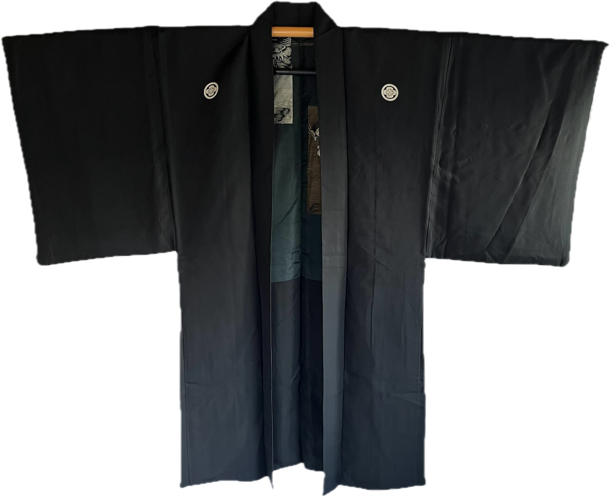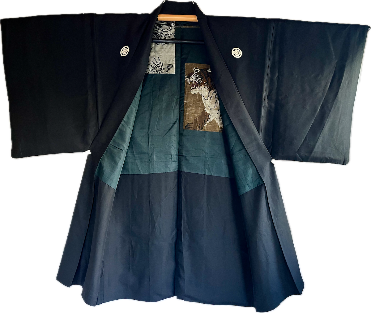 Haori Japonais Homme Antique en Soie Noire – Montsuki Mokkou Dragon VS Tigre